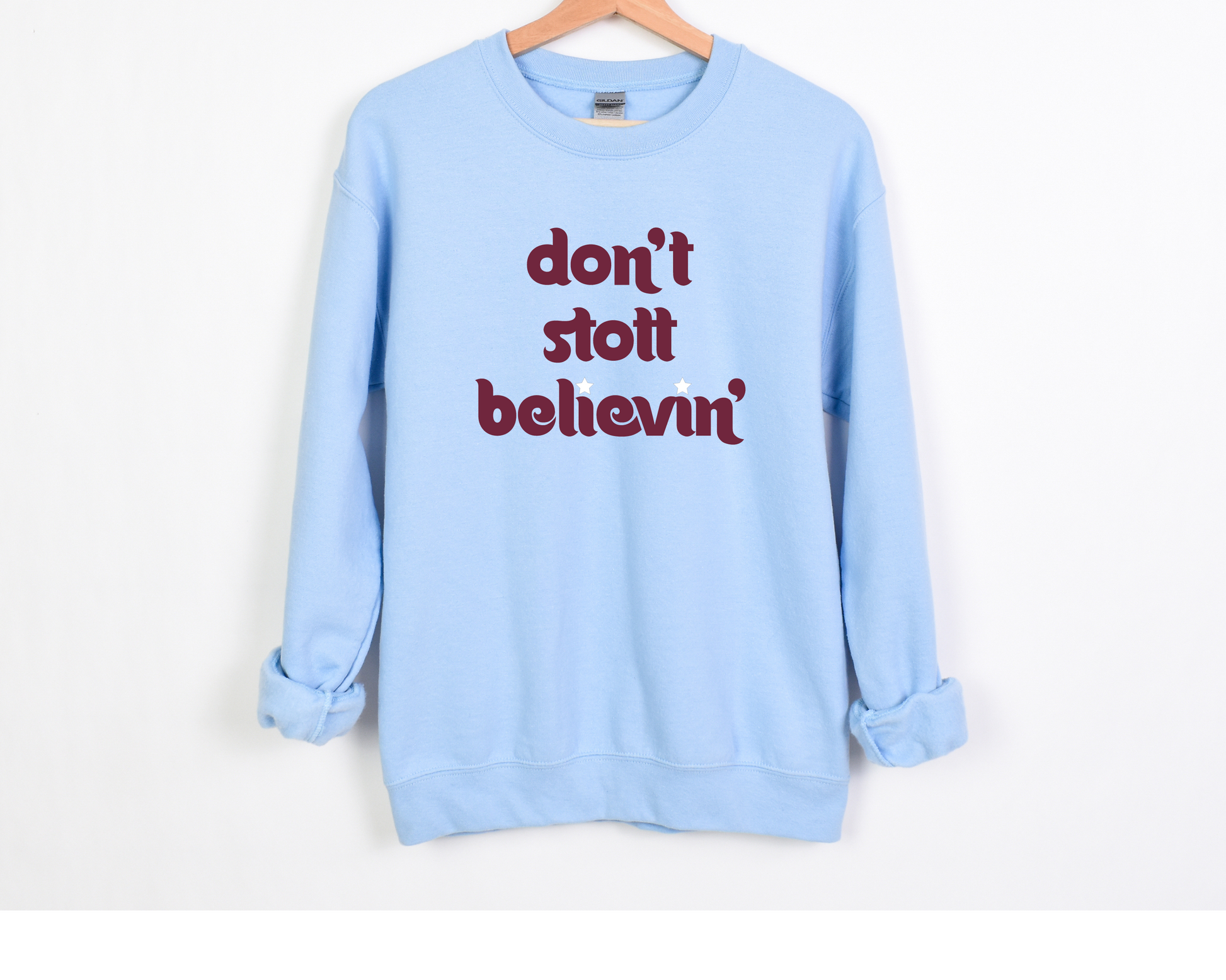 50/50 cotton/polyester, light blue colored crewneck sweatshirt